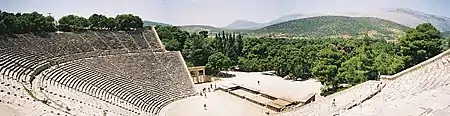 O primeiro evento com diálogos registrado foi uma apresentação anual de peças sagradas no Antigo Egito do mito de Osíris e Ísis, por volta de 2500 a.C.,[6] que conta a história da morte e ressurreição de Osíris e a coroação de Horus.[7] A palavra 'teatro' e o conceito de teatro, como algo independente da religião, só surgiram na Grécia de Pisístrato (560-510 a.C.), tirano ateniense que estabeleceu uma dinâmica de produção para a tragédia e que possibilitou o desenvolvimento das especificidades dessa modalidade. As representações mais conhecidas e a primeira teorização sobre teatro vieram dos antigos gregos, sendo a primeira obra escrita de que se tem notícia, a Poética de Aristóteles.