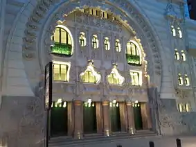 O elemento externo mais relevante é a fachada principal, a que deve a alcunha de bombonera (caixa de bombons). Nela destaca-se o grande arco em ferradura, com reminiscências orientais que circunscreve as portas de acesso do público. Profusamente decorada com motivos naturalistas, animais fantásticos e estilizações vegetais, incorpora aplicações cerâmicas com motivos mitológicos. É da autoria do basco francês Darroquy e as cerâmicas são de Daniel Zuloaga.