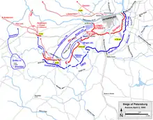 Ulysses S. Grant havia decidido, no entanto, que havia uma maneira mais eficiente de chegar a Richmond e Robert E. Lee. A alguns quilômetros ao sul, a cidade de Petersburg continha ligações ferroviárias cruciais que abasteciam a capital. Se o Exército da União pudesse aproveitá-lo, Richmond seria tomada. No entanto, Benjamin Butler não conseguiu capturá-lo mais cedo e, em seguida, os avanços indecisos dos subordinados de Grant também falharam em romper as linhas ferroviárias sob os homens de P. G. T. Beauregard, permitindo que o exército de Lee chegasse e erguesse as defesas. Ambos os lados se prepararam para um cerco.[64]