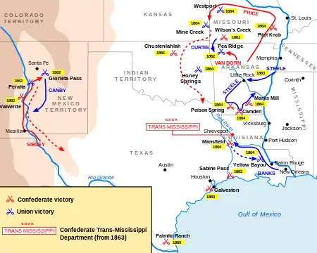 Na Campanha de Red River de 1864, uma força da União sob o comando do major-general Nathaniel P. Banks tentou obter o controle sobre o noroeste da Luisiana, mas foi impedida por tropas Confederadas comandadas por Richard Taylor. A Incursão de Price, uma tentativa liderada pelo major-general Sterling Price para recapturar o Missouri para os Confederados, terminou quando as tropas de Price foram derrotadas na Batalha de Westport naquele outubro. Em 2 de junho de 1865, depois que todos os outros grandes exércitos Confederados do campo ao leste haviam se rendido, Kirby Smith entregou oficialmente seu comando em Galveston, no Texas. Em 23 de junho, Stand Watie, que comandou as tropas do Sul do Território Indígena, se tornou o último general Confederado a se render.