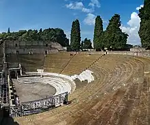 - Cávea (cavea), estrutura semi-circular onde, segundo a escala social, sentavam-se os espectadores. Era sub-dividido em: cávea inferior (ima cavea), cávea média (media cavea) e cávia superior (summa cavea).