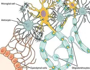 Os gliócitos ou células da glia fazem parte do tecido nervoso com a função de envolver, proteger e nutrir os neurônios.[4] Recentemente descobriu que essas células também tem a capacidade de estabelecer conexão umas com as outras. O termo glia em grego significa cola, sendo utilizada em alusão a sustentação e união que realizam nas células do SN. A primeira célula do tipo glial foi descrita pela primeira vez por Heinrich Müller em 1851. Müller detectou essas células na retina de algumas espécies animais como o peixes, aves e humanos.[8] E no decorrer da história diversos estudos e técnicas são utilizadas para se conhecer mais desse diversificado grupo de células.
