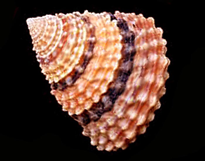 Conchas de T. coronatus Valenciennes, 1832[1], apresentando faixas castanhas sobre cores em creme e cor-de-rosa a tons alaranjados ou amarelados.
