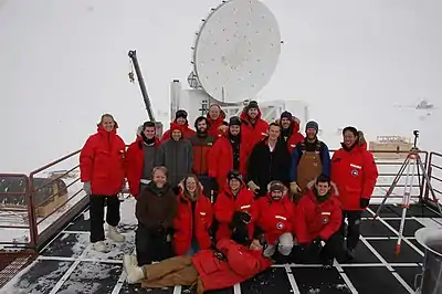 O Telescópio do Polo Sul. Uma imagem da equipe, em frente ao telescópio.