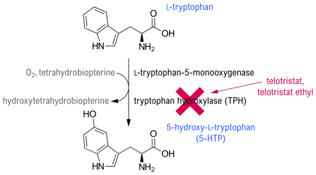 Telotristat é um inibidor da triptofano hidroxilase,[5] o qual media o passo limitante de taxa na biossíntese de serotonina.[1]