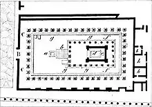 O próprio templo, um peripteros com 48 colunas jônicas, subia ao pódio e subia um conjunto imponente de degraus, numa fusão de idéias arquitetônicas gregas e itálicas. Invulgarmente, o cella é situado mais para trás em relação ao peristilo. Em frente aos degraus ainda pode ser visto um altar de mármore branco sobre uma base de travertino, com uma inscrição em latim com os nomes dos quattuorviri que o dedicaram. Ao lado dos degraus, há uma coluna jônica que sustentava um relógio de sol.