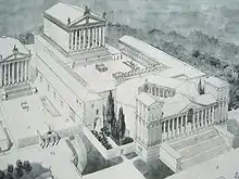 O complexo do templo fica em uma praça elevada erguida 7 m (23 pés) sobre uma base anterior em forma de T que consiste em um pódio, escada e paredes de fundação.[lower-alpha 2] Essas paredes foram construídas a partir de cerca de 24 monólitos, em seu nível mais baixo, pesando aproximadamente 300 toneladas cada. A parede de contenção mais alta, a oeste, tem um segundo curso de monólitos contendo as famosas "Três Pedras" (em grego: Τρίλιθον, Trílito):[8] cortados de calcário, medindo mais de 19 m (62 pés) de comprimento, 4,3 m (14 pés) de altura e 3,6 m (12 pés) de largura, pesam aproximadamente 800 toneladas cada.[9] (Uma quarta pedra, ainda maior, chamada de Pedra da Mulher Grávida, não foi utilizada na pedreira próxima a 800 m (2.600 pés) da cidade[10] e pesa cerca de 1.000 toneladas.[11] Uma quinta, pesando aproximadamente 1.200 toneladas[12] encontra-se na mesma pedreira.) Através da fundação correm três enormes passagens do tamanho de túneis ferroviários.[8]