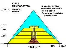 - Quanto à altura, a pirâmide de Keops mede aproximadamente 147 m e a Pirâmide do Sol, 65 m (sem incluir os supostos 10 metros que teria o seu templo do topo; pela sua vez a altura da pirâmide de Kukulcán atinge os 24 m até o patamar superior, mais 6 m do seu templo para conseguir 30 m. A base da construção egípcia tem medidas aproximadas de 226,5 m, enquanto a do Sol atinge os 225 m. Pela sua vez a pirâmide de Kukulcán apenas mede 55,3 m nas bases das suas fachadas.