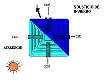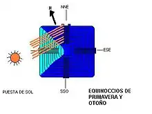 Referindo ao hemisfério norte do planeta, durante um ano o sol parece colocar-se na linha do horizonte num ponto mais austral durante o solstício de Inverno (Dezembro), passando por um ponto intermédio durante o equinócio de Primavera (Março) e chegando a um ponto mais setentrional durante o solstício de Verão (Julho), para regressar novamente ao ponto intermédio durante o equinócio de Outono (Setembro) e reiniciar o ciclo novamente.