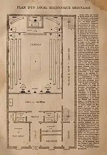 A entrada do templo está localizado no lado ocidental (oeste). Em ambos os lados da porta, da esquerda para a direita estão duas colunas, chamado Boaz e Jachin, e comumente referido por suas iniciais, J.(Jachin) e B.(Boaz), sendo as mesmas cobertas, com um capitel decoradas com "granadas", parcialmente aberta..[3] A granada foi utilizada como decoração para o templo de Salomão.[4] De acordo com os ritos, as colunas são colocados de maneira diferente: No Rito Escocês, é para o norte e Boaz e Jachin para o sul e é o oposto dos Ritos Francês e do rito egípcio. O templo é composto por uma sala rectangular e sem janelas. É uma representação do mundo e do Cosmos. O templo, é simbolicamente orientado de oeste para leste (de oeste para leste) sobre a duração do Norte (norte) ao meio-dia sobre a largura do nadir e do zénite da sua altura. O limite máximo é idealmente as cúpulas e o decorado, como um céu (azul escuro ou preta, estrelas). A linha é rematado, por vezes, suspenso acima do centro do Templo. O solo, é constituído por uma calçada em mosaico, quer na sua totalidade, ou pelo menos um na central do rectângulo. Em alguns rituais, no centro do templo, estão três pilares dispostos em um triângulo e uma "mesa de casas" nos principais símbolos maçônicos. Dois escritórios, chamados de placas, são organizados contra os parapeitos do Oriente, Norte e Sul, face-a-face. Outra secretária/placa, é colocada ao lado da coluna do norte, de frente para leste. Nos ritos francês e do egípcio, a Quarta Câmara está disposta perto da coluna do Sul, que também, está em frente ao leste. No rito escocês, o quarto platô se localiza no meio das cadeiras e nos bancos para o almoço, de frente para o norte. Estes quatro "platôs", estão ocupados por um funcionário da apresentação.