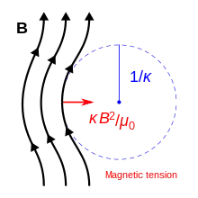 tem magnitude igual à curvatura, ou o recíproco do raio de curvatura, e é direcionado de um ponto em uma linha de campo magnético para o centro de curvatura. Portanto, à medida que a curvatura da linha do campo magnético aumenta, também aumenta a força de tensão magnética que resiste a essa curvatura.[2][1]
