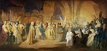 Frédéric Chopin tocando no Hôtel Lambert, em Paris. A abóbada (ao fundo) é um cenário temporário. Aquarela e guache por Teofil Kwiatkowski.