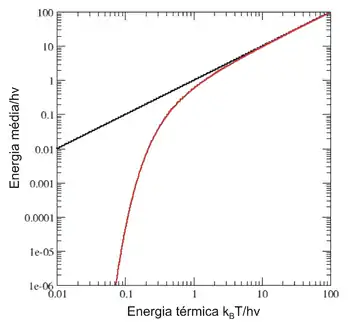 A altas temperaturas, quando a energia térmica kBT é muito maior que o espaçamento hν entre níveis de energia, o argumento exponencial βhν é muito menor que um e a energia média é kBT, o que está de acordo com o teorema da equipartição (Figura 10). No entanto, a baixas temperaturas, quando hν >> kBT, a energia média cai a zero — os níveis de energia de altas frequências encontram-se "congelados" (Figura 10). Outro exemplo é o caso dos estados electrónicos excitados de um átomo de hidrogénio que não contribuem para a sua capacidade térmica, quando em estado gasoso e a temperatura ambiente, porque a energia térmica kBT (aproximadamente 0.025 eV) é muito menor que o espaçamento entre o nível de energia electrónico inferior e o próximo nível de energia electrónico (aproximadamente 10 eV).