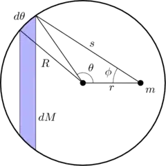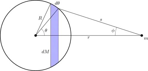 A força exercida no ponto "m" pode ser calculada integrando a força gravitacional de todas as secções.