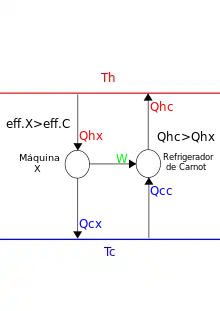 Se a máquina X é mais eficiente do que a máquina de Carnot, é possível associá-la a uma máquina de Carnot de modo a violar a segunda lei da termodinâmica, por exemplo, como na figura. A máquina composta pela associação do refrigerador de Carnot e X não recebe trabalho externo, já que o trabalho realizado por X alimenta o refrigerador.