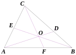 Teorema de Ceva. Seja ABC um triângulo qualquer e D, E e F pontos sobre os lados BC, CA e AB, respectivamente. Como mostra a figura acima. Os seguimentos AD, BE e CF são concorrentes se, e somente se,