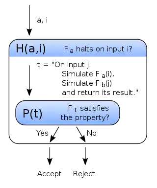 Suponha que P(a) é um algoritmo que decide alguma propriedade não trivial de Fa. Sem perda de generalidade, podemos supor que P (não-para) = "não", com não-para pode ser a representação de um algoritmo que nunca para. Se isso não for verdade, então este irá realizar a negação da propriedade. Uma vez que P que decide uma propriedade não-trivial, segue-se que há uma string b que representa um algoritmo e P(b) = "sim". Podemos então definir um algoritmo H(a, i ) como segue: