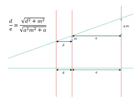 De uma forma mais simples: Nós aplicamos a mudança 'a' e é igual à razão 'e/d', ou seja 'e/d' é a razão de proporcionalidade em ambas as retas não paralelas. Dizendo por outras palavras, 'a' e 'e/d' são iguais, isto é, as 'mudanças' são iguais.[24]