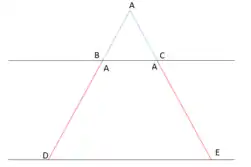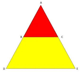 Isto deve-se ao facto de que (seguindo o teorema de Tales) temos retas transversais (AB e AC) e retas paralelas (DE e BC), além disso, AB=AD+DB e AC=AE+EC, ou seja:
