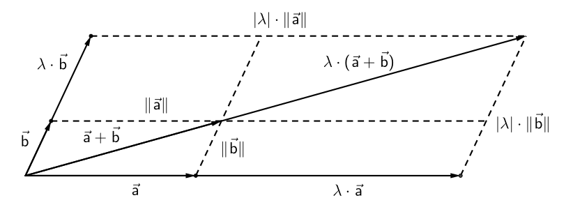 No estudo da geometria vetorial, o teorema de Tales assegura a propriedade: λ(a+b)=λ.a +λ.b com λ ∈ IR. As duas configurações abaixo correspondem aos casos em que α > 0 e α < 0. O teorema de Tales faz-se necessário para justificar esta propriedade se não quisermos considerá-la como axioma.