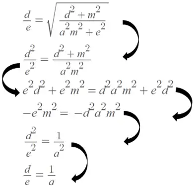 [23]A partir da figura que segue podemos demonstrar a veracidade do teorema. Se o teorema está correto, podemos concluir que a (número que alterou do comprimento formando a.m) terá de ser igual a e/d (que é a mesma coisa que d/e=1/a):