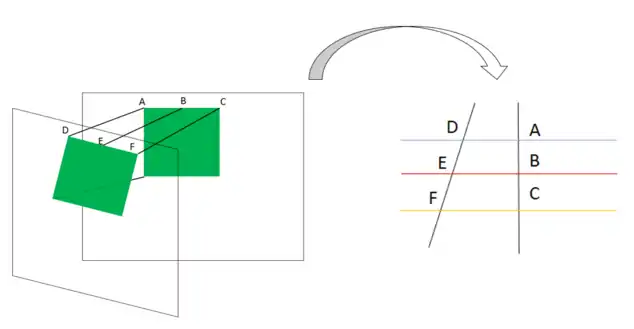 Assim podemos reparar que houve uma deformação, ou seja, o plano com os pontos D, E, F não é paralelo com o plano com os pontos A, B, C.
