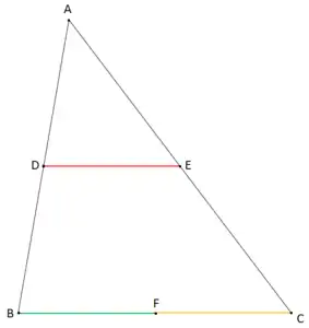 Este teorema defende que a ligação de dois pontos médios (neste caso D e E) de dois lados do triângulo (AB e AC) forma um segmento correspondente à metade do triângulo inicial (neste caso ABC).[27]