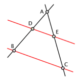 O teorema de Tales é um teorema da geometria que afirma que, num plano, a interseção de retas paralelas, por retas transversais, formam segmentos proporcionais.[2] Em inglês, é conhecido como o Intercept theorem (Teorema da Interseção);[3] em alemão, chama-se Strahlensatz,[4] isto é, o teorema dos raios.