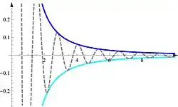 Repare que a função está "enquadrada" (i.e., limitada inferior e superiormente) pelas outras duas funções: