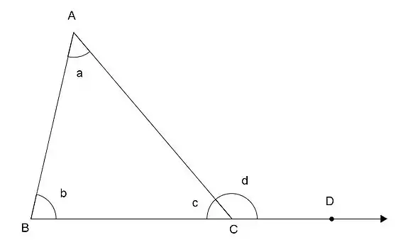 Na figura abaixo observamos que os ângulos , , são os ângulos internos do triângulo e temos que é um ângulo externo. Assim, um ângulo externo de um triângulo é o ângulo formado pelo prolongamento de um lado e o lado adjacente. O ângulo externo é suplementar ao interno adjacente.[2]