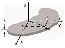 Considere p como uma lâmina plana fina e uniforme. Considere sendo um elemento de massa com distância perpendicular de um eixo OZ perpendicular ao plano e passando através de um ponto O no plano.