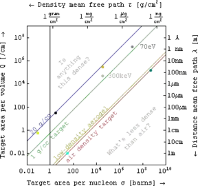 onde Io é o fluxo inicial, comprimento de caminho Δx ≡ x − xo, a segunda igualdade define uma interação de livre caminho médio λ, a terceira usa o número de alvos por unidade de volume, η, para definir uma área de seção de choque σ, e a última usa a densidade de massa do alvo, ρ, para definir uma densidade de livre caminho médio, τ. Dessa forma, podemos relacionar essas quantidades por meio de Q = 1/λ = ησ = ρ/τ, como mostrada na figura à esquerda.