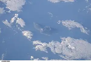 Foto de satélite de La Palma, nas Ilhas Canárias (norte está na parte inferior direita). A grande cratera no centro é a Caldeira de Taburiente. O Cumbre Vieja é um cume ao sul da caldeira (à esquerda).