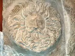 Nas extremidades do frontão, existe um par de tritões, criaturas mitológicas metade homem e metade peixe, e serviçal do deus das águas, Neptuno. O centro da parte inferior esquerda está decorado com um golfinho, enquanto que a parte inferior direita está protagonizada por uma coruja escondida. A parte central foi decorada com gravuras de mulheres que carregam um escudo de folhas de carvalho, simbolizando portanto a Vitória. Acima de todo o complexo, destaca-se uma grande estrela situada naquilo que seria a parte mais alta do edifício. Subjugada à estrela, encontra-se a cabeça da górgona, com serpentes entrelaçadas ao seu queixo, asas acima de suas orelhas e um grande bigode.[22] Entretanto, existem controvérsias em relação à veracidade do que a gravura representa, pondo em questão se seria efectivamente uma górgona, já que esta é normalmente do sexo feminino.[24] Existem interpretações alternativas que vêem a cabeça como uma representação do deus do mar, Oceano ou como o deus do Sol, o qual as tribos celtas cultuavam.[10]