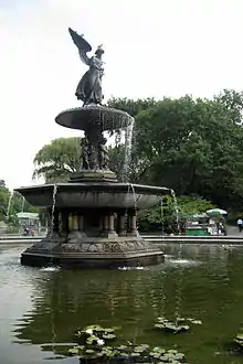 O lago é centrado por uma escultura de fonte projetada por Emma Stebbins em 1868 e inaugurada em 1873. Stebbins foi a primeira mulher a receber uma encomenda pública para uma grande obra de arte na cidade de Nova York. A estátua de bronze de quase 2,5 metros retrata um anjo alado feminino tocando o topo da fonte, onde a água jorra e cai em uma bacia superior e no lago ao redor. Era a única estátua do parque prevista no projeto original. Abaixo dela estão quatro querubins de mais de um metro de comprimento, representando Temperança, Pureza, Saúde e Pa . Também chamado de Anjo das Águas, a estátua se refere a Cura do paralítico em Betesda , uma história do Evangelho de João sobre um anjo abençoando o tanque de Betesda, dando-lhe poderes de cura. No Central Park, o referente é o Aqueduto de Croton inaugurado em 1842, fornecendo à cidade pela primeira vez um suprimento confiável de água pura: assim, o anjo carrega um lírio em uma mão, representando a pureza, e com a outra ela abençoa a água abaixo.[11]