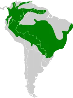 Vive em bordas de mata e em mata de galeria, no topo das árvores. Ocorre do Panamá até o nordeste da Argentina. No Brasil, é encontrado do sul do Amazonas, Pará e Maranhão, Distrito Federal até o Rio Grande do Sul.