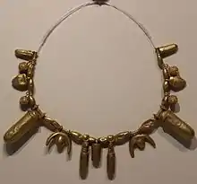 É um colar de ouro que está composto por 11 pingentes, quatro bolas e treze pendentes fusiformes de diferente tamanho. Destacam-se os pendentes teminados em cabeça de falcão; cabeça de serpente, ou forma de lua crescente. Os pendentes têm na parte superior um furo por onde passaria o fio.[5]
