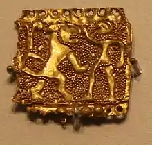A placa rectangular de ouro gravado em alto-relevo tem uma cena de uma luta entre um homem e um leão rampante. O trabalho está elaborado com influências fenícias no tecnicismo dos adornos de pequeno tamanho e na iconografia empregada.[9]
