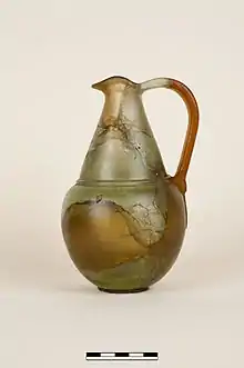 A peça tem dimensões de 15 cm de altura por 9 cm de diâmetro. A jarra está gravada em vidro de cor verde, opaco e com as paredes muito grossas. É de corpo piriforme com uma alça e escrita hieroglífica, a sua procedência será egípcia tendo chegado à Península Ibérica como objecto de luxo.[10]