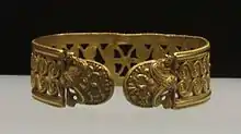 A bracelete é formada por uma grossa lâmina de ouro com trabalho intercalado de duas séries de espirais entrelaçadas que partem do centro para direcções opostas até os extremos. As extremidades da bracelete encontram-se decoradas com um cordão liso. Arremates finais dos extremos têm forma de palmas decoradas em seu interior com flores de lótus.[7]