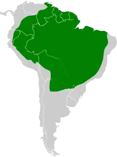 Pode ser encontrada nos seguintes países: Argentina, Bolívia, Brasil, Colômbia, Equador, Guiana Francesa, Guiana, Paraguai, Peru, Suriname, Trinidad e Tobago e Venezuela.[1]