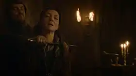 Catelyn percebe que Lorde Roose Bolton está usando uma cota de malha por de baixo de suas vestes, e percebe que foram traídos. Lorde Walder faz sinal para seus homens atacarem as forças Stark, e Lothar mata Talisa ao esfaqueá-la repetidas vezes na barriga. Antes de conseguir reagir, Robb é atingido por uma flecha. Arya vê homens Frey matando soldados Stark e Vento Cinzento, o lobo gigante de Robb. Ela é salva por Cão de Caça, que a deixa inconsciente e a leva embora. Dentro, apesar de ferida, Catelyn consegue pegar Joyeuse Frey, a jovem esposa de Lorde Walder, como refém, exigindo que eles deixem Robb ir embora. Lorde Walder se recusa, e Roose Bolton esfaqueia Robb no coração dizendo, "Os Lannister mandam lembranças". Catelyn mata Joyeuse antes de Walder Negro cortar sua garganta.[1]