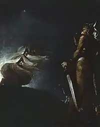 Macbeth, perturbado, vai às bruxas mais uma vez. Elas conjuram então três espíritos, em meio a três outros avisos e profecias, que lhe mandam ter "cuidado com Macduff", porém também lhe avisam que "ninguém que tenha nascido de uma mulher fará mal a Macbeth", e que ele "jamais será vencido até que a Grande Floresta de Birnam vá até as alturas do Monte Dunsinane". Como Macduff está exilado na Inglaterra, Macbeth presume que está seguro; então condena à morte todos do castelo de Macduff, incluindo Lady Macduff e suas crianças.