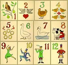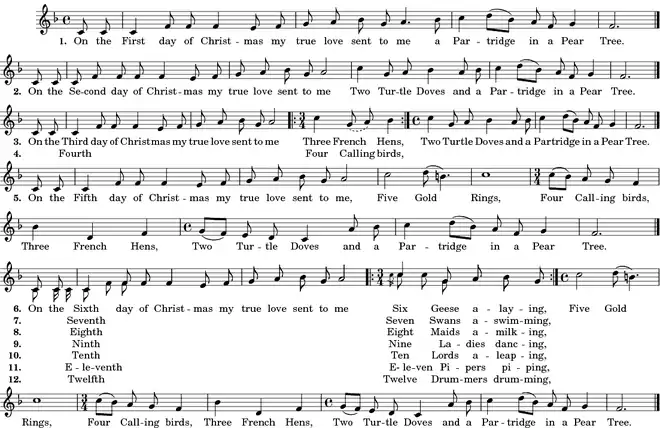 - Este artigo foi inicialmente traduzido, total ou parcialmente, do artigo da Wikipédia em inglês cujo título é «The Twelve Days of Christmas (song)», especificamente desta versão.