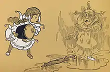 Ilustração de William Wallace Denslow para primeira edição mostrando Dorothy a derrotar a bruxa.