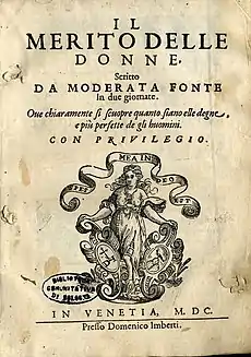 - Fonte, Moderata (2007). «Moderata Fonte and the Worth of Women». The Worth of Women: Wherein Is Clearly Revealed Their Nobility and Their Superiority to Men. [S.l.]: University of Chicago Press. 1 páginas. ISBN 9780226256832 – via Google Books