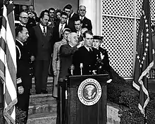 Pela galanteria e intrepidez conspícuas com o risco de sua vida acima e além do seu dever como piloto do Esquadrão de Caça 32, ao tentar resgatar um companheiro de esquadrão cujo avião foi atingido por fogo antiaéreo e fumaça, foi forçado a descer atrás das linhas inimigas. Rapidamente manobrando para circundar o piloto abatido e protegê-lo das tropas inimigas que infestavam a área, o tenente (J.G.) Hudner arriscou sua vida para salvar o aviador ferido que estava preso vivo nos destroços em chamas. Consciente do extremo perigo de aterrissar no acidentado terreno montanhoso e da escassa esperança de escapar ou sobreviver a uma temperatura abaixo de zero, pousou habilmente o avião em uma aterrissagem deliberada na presença de tropas inimigas. Com as mãos nuas, ele empacotou a fuselagem com neve para manter as chamas longe do piloto e lutou para libertá-lo. Malsucedido nisso, ele retornou à sua aeronave acidentada e comunicou-se por rádio com outros aviões no ar, solicitando que um helicóptero fosse despachado com um machado e um extintor de incêndio. Ele então permaneceu no local, apesar do perigo contínuo da ação do inimigo e, com a ajuda do piloto de resgate, renovou uma batalha desesperada, mas inútil, contra o tempo, o frio e as chamas. A ação excepcionalmente valente do Tenente (J. G.) Hudner e sua devoção altruísta a um companheiro de navio sustentam e aprimoram as mais altas tradições do Serviço Naval dos EUA.[61]