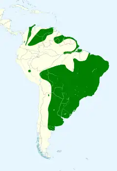 Pode ser encontrada nos seguintes países: Argentina, Bolívia, Brasil, Colômbia, Guiana Francesa, Guiana, Paraguai, Peru, Suriname, Uruguai e Venezuela. Seus habitats naturais são: savanas áridas, campos de gramíneas de baixa altitude subtropicais ou tropicais sazonalmente húmidos ou inundados e pastagens.[1]