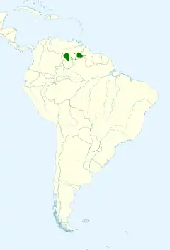 Pode ser encontrada nos seguintes países: Brasil, Guiana e Venezuela. Seus habitats naturais são: regiões subtropicais ou tropicais húmidas de alta altitude.[1]