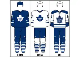 As primeiras informações eram que as cores da equipe teria de ser alterado para vermelho e branco,[3] mas o Leafs vestiram blusas brancas com uma folha maple verde para o seu primeiro jogo em 17 de fevereiro de 1927.[4] Na próxima temporada, o Leafs apareceu pela primeira vez com as camisas azuis e brancas que têm usado desde então. O Maple Leafs diz que o azul representa o céu canadense e o branco a neve, mas na verdade, o azul tem sido cor esportiva principal em Toronto desde que o Toronto Argonauts a adoptou como sua principal cor em 1873.
